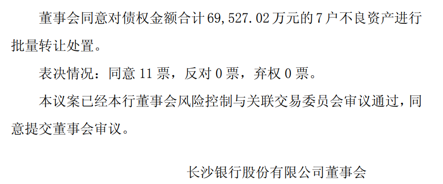 11月18日,长沙银行第八届董事会第二次临时会议有筹画公告清爽,董事会得意对债权金额所有69,527.02万元的7户不良金钱进行批量转让措置。 开云kaiyun体育